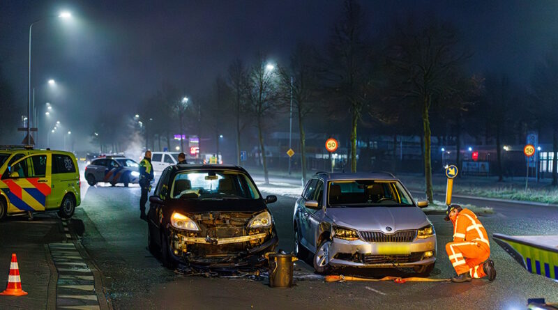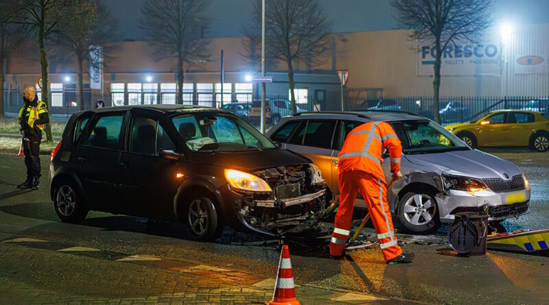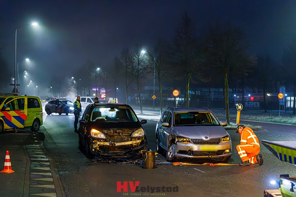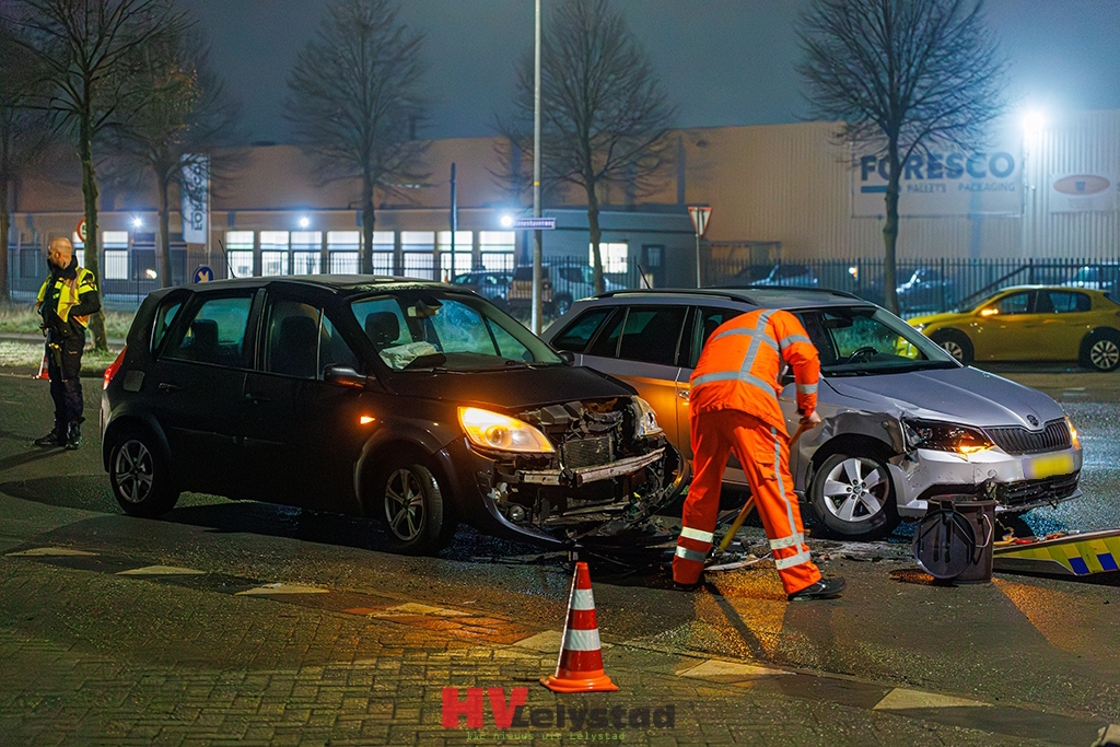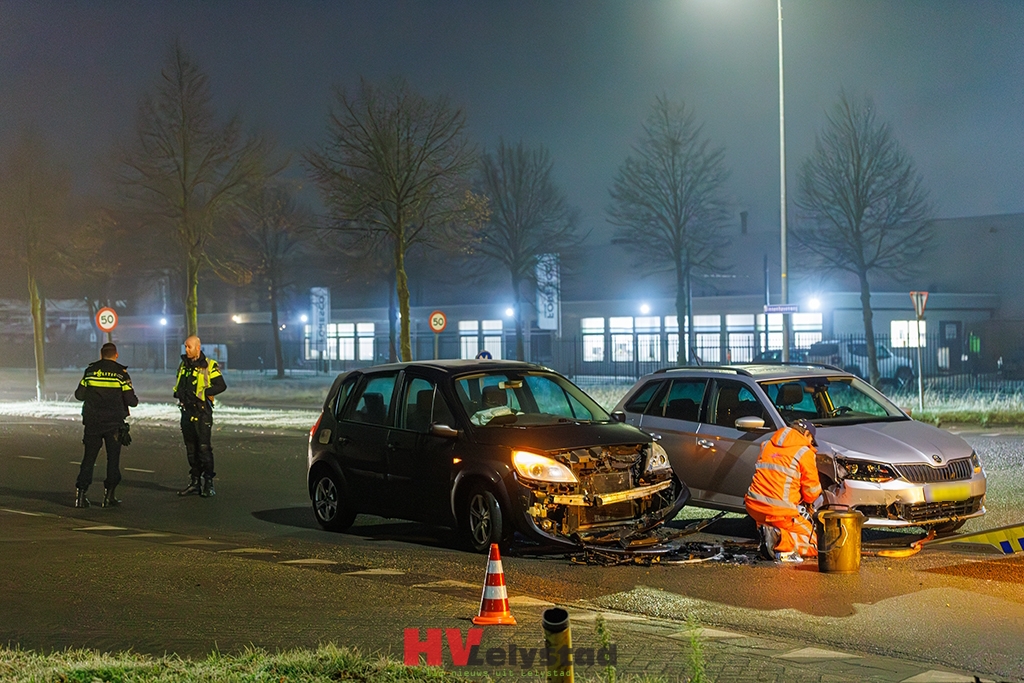 Op de kruising van de Binnenhavenweg met de Asfaltweg in Lelystad zijn dinsdagochtend twee auto’s op elkaar gebotst.